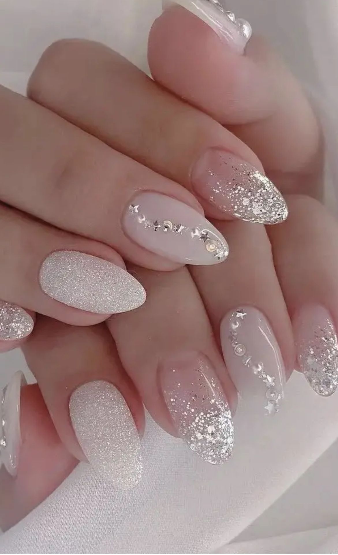 For those who love to go all out, combining glitter polish with scattered rhinestones creates a shimmering masterpiece. Choose a bold base color like silver, gold, or royal blue and layer on small and medium-sized gems across the nail bed. This is ideal for parties, New Year’s Eve, or any event where you want your hands to shine as much as your outfit.
