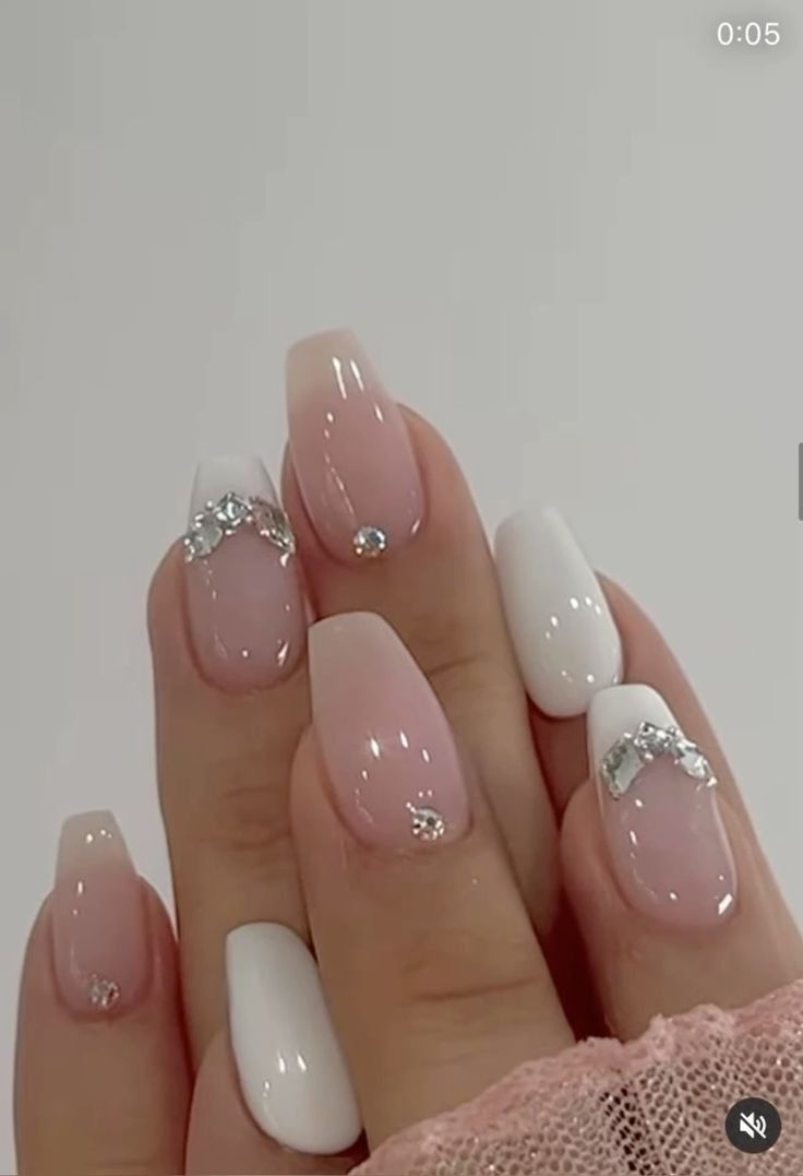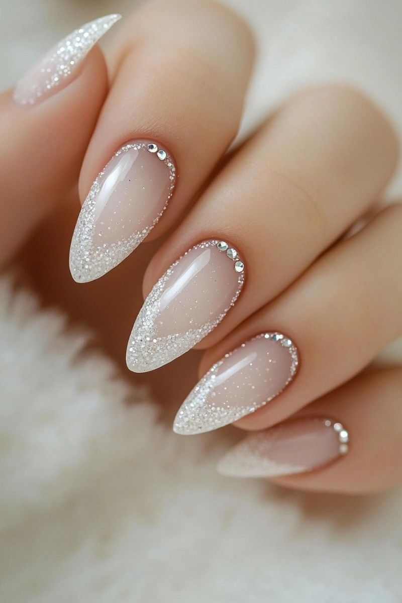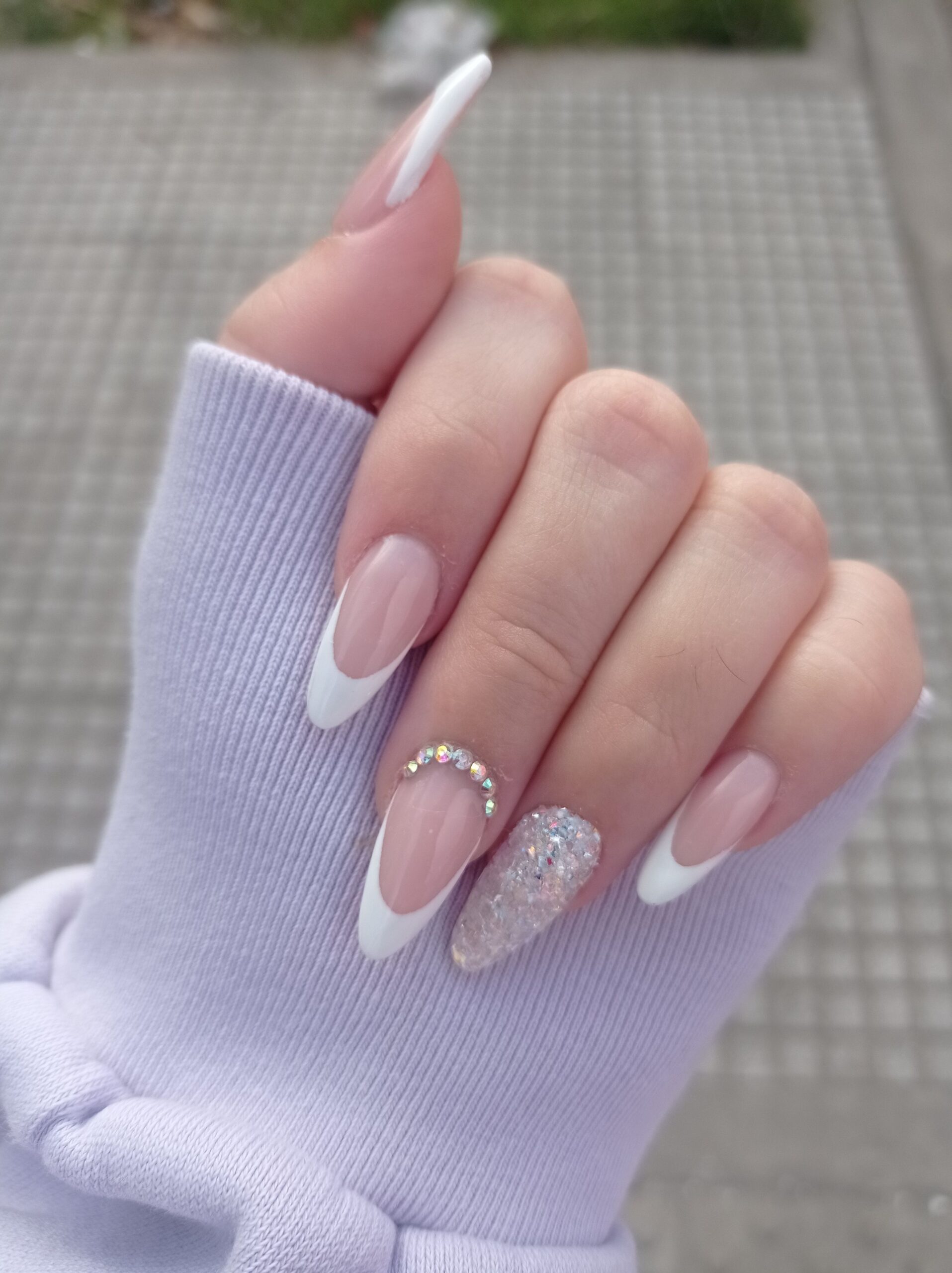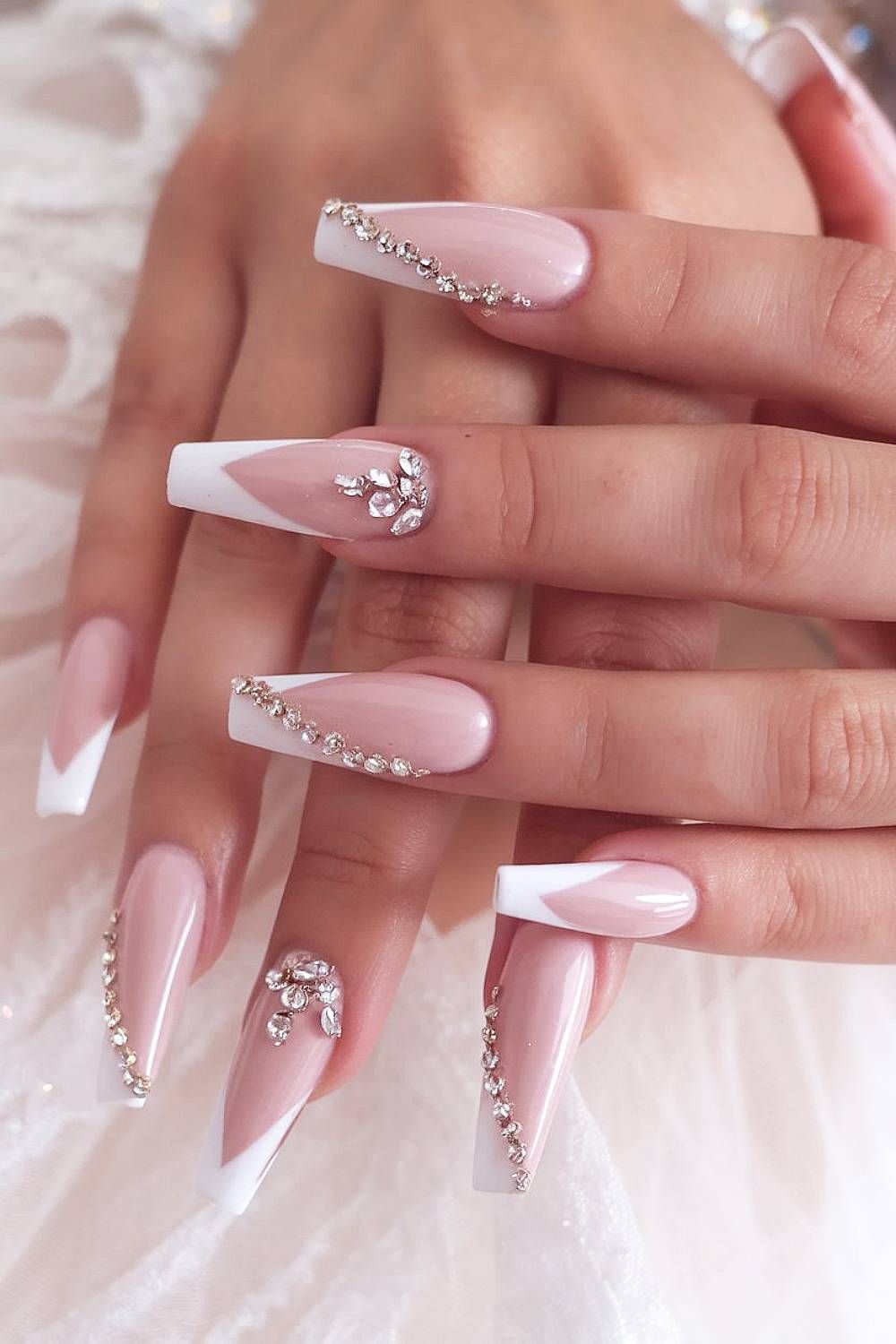 You can never go wrong with a French manicure, but adding a touch of sparkle turns this traditional look into something truly show-stopping. Think crisp white tips, clean nude bases, and a row of rhinestones lining the smile line or cuticle. It’s a perfect choice for brides, professionals, or anyone seeking a classy upgrade.