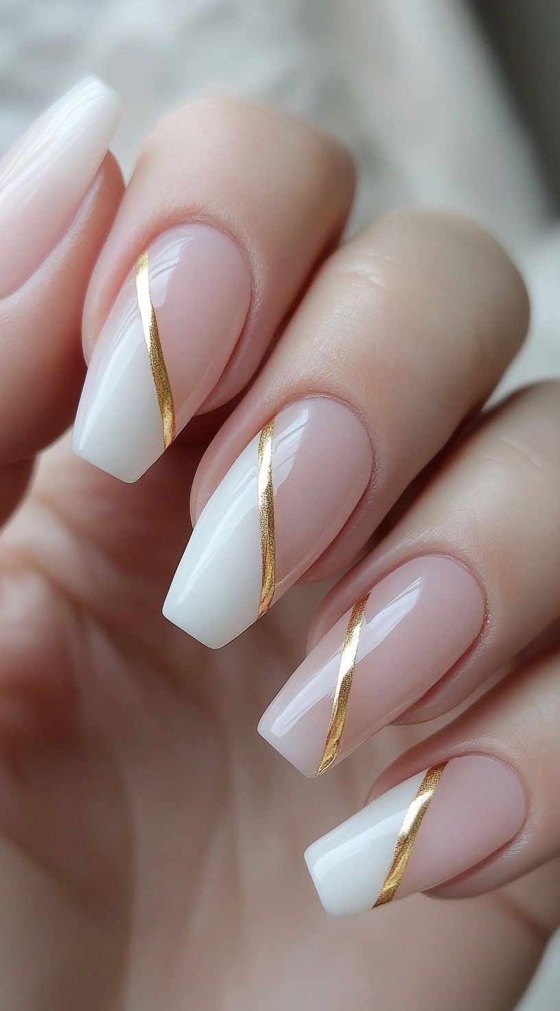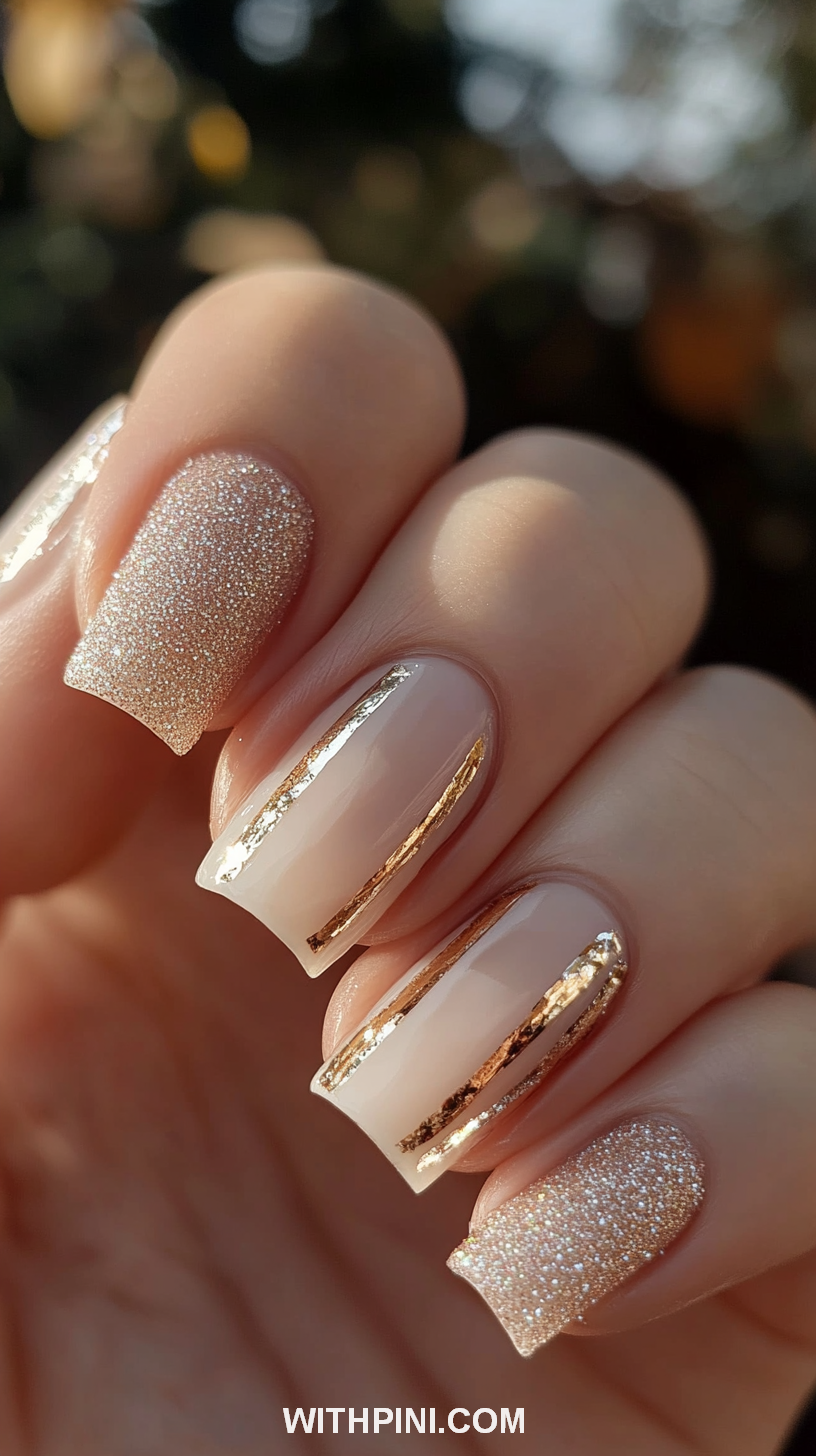 Coffin or ballerina nails, popular in editorial and high-fashion circles, are perfect for geometric gold accents or luxurious glitter fades. Their flat tips provide a structured background that makes any gold element stand out. If you prefer short nails, don’t worry—rounded shapes can still carry gold striping or foil accents beautifully, offering an everyday elegance that’s both practical and pretty.