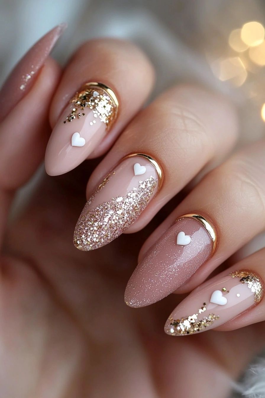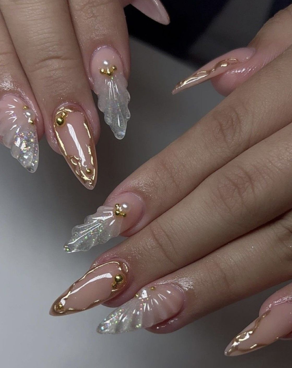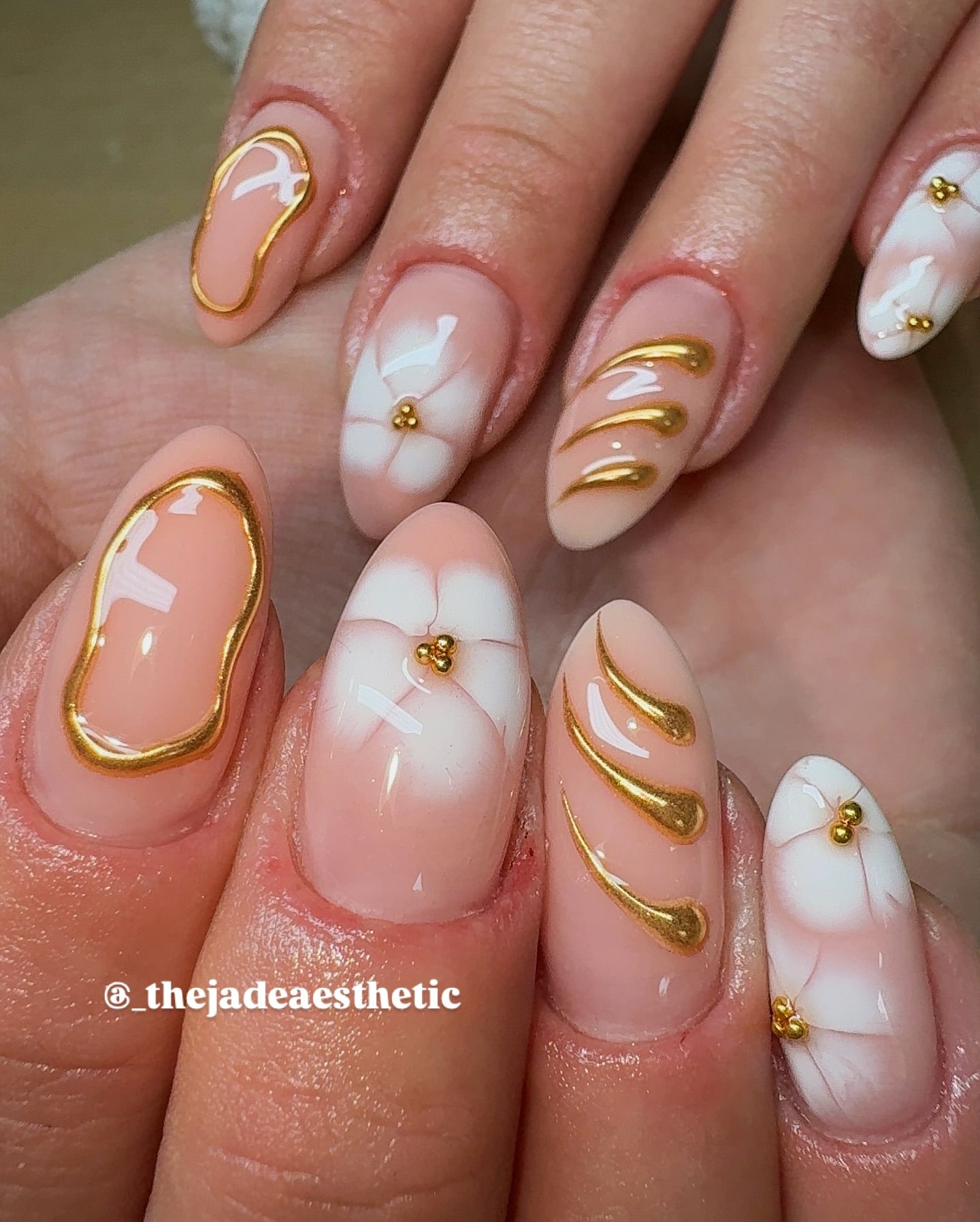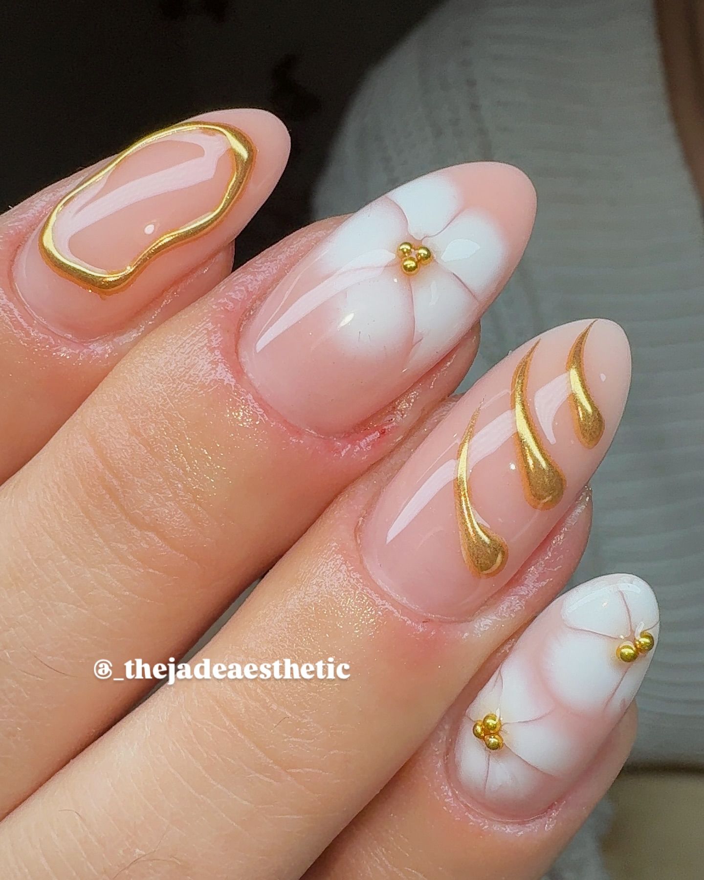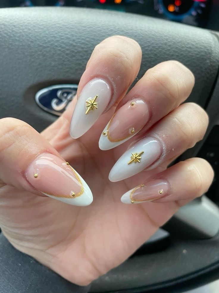 For those who love muted tones, nude nails with subtle gold flakes or striping tape provide a clean yet luxe finish. Meanwhile, black and gold combos are perfect for making a bold, high-contrast statement. White and gold pairings, on the other hand, create a soft and ethereal vibe that’s perfect for weddings or upscale gatherings.