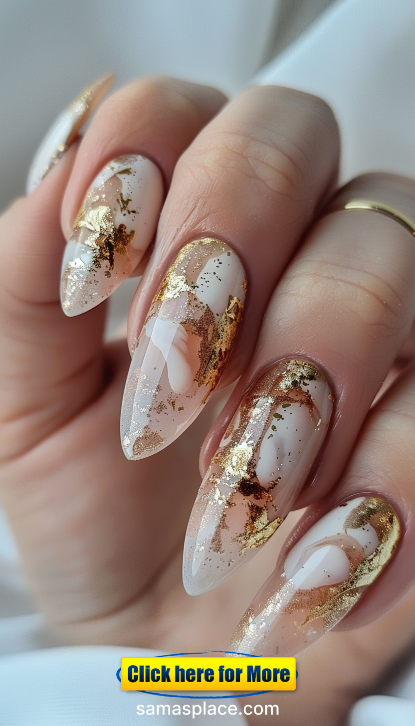 While gold details look stunning on every nail length and shape, certain styles amplify their elegance. Almond-shaped nails, with their elongated and tapered tip, are a classic canvas for delicate gold linework or foil. They offer just enough space for artistic detailing without feeling too flashy.
