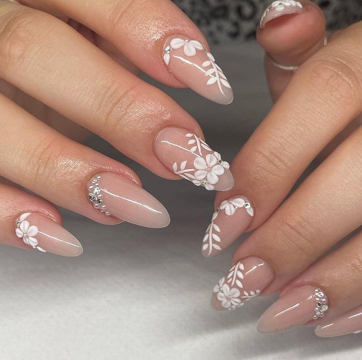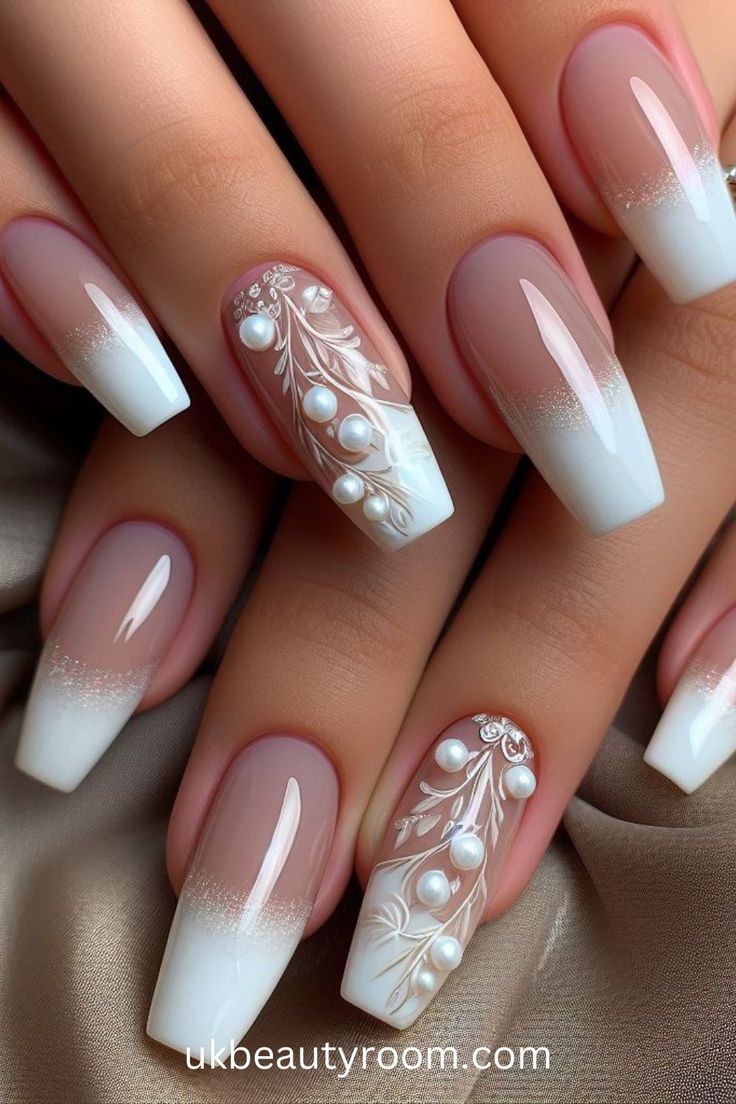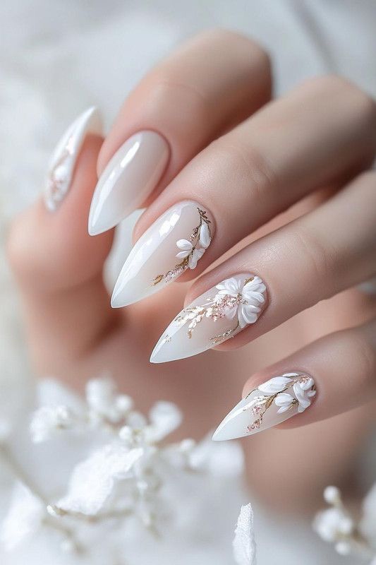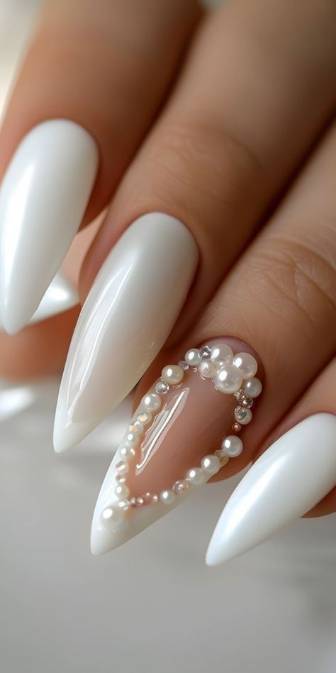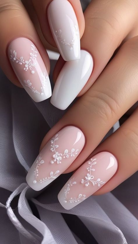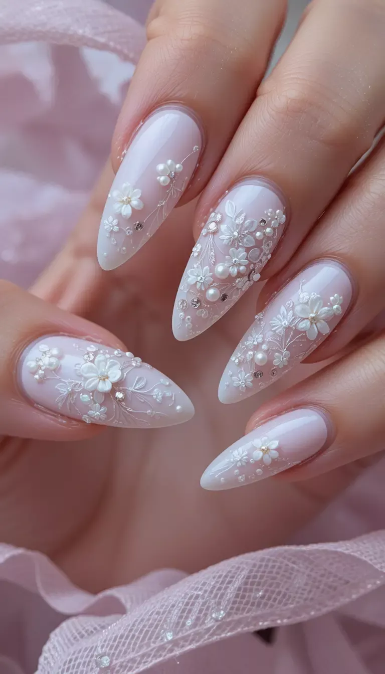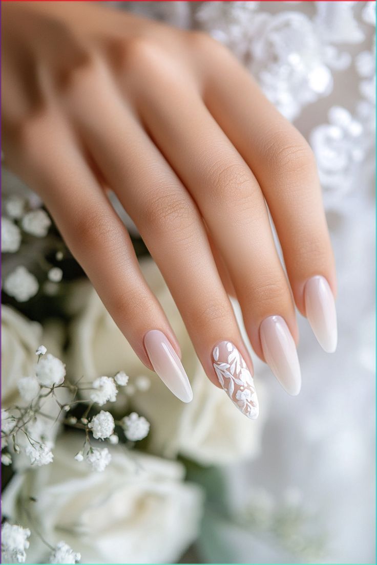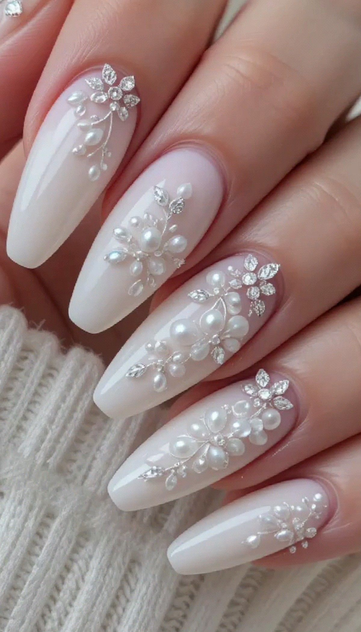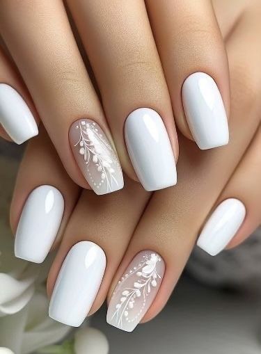 White nails are a bold yet minimalist option, perfect for brides who want their hands to pop without a complicated design. Crisp white polish looks incredibly sleek, especially when paired with squared or almond-shaped nails. Ivory nails offer a softer, more traditional variation that feels less stark but equally bridal. Many brides incorporate white lace patterns, subtle chrome effects, or tiny gems to break up the monochrome look and add a bridal flourish.