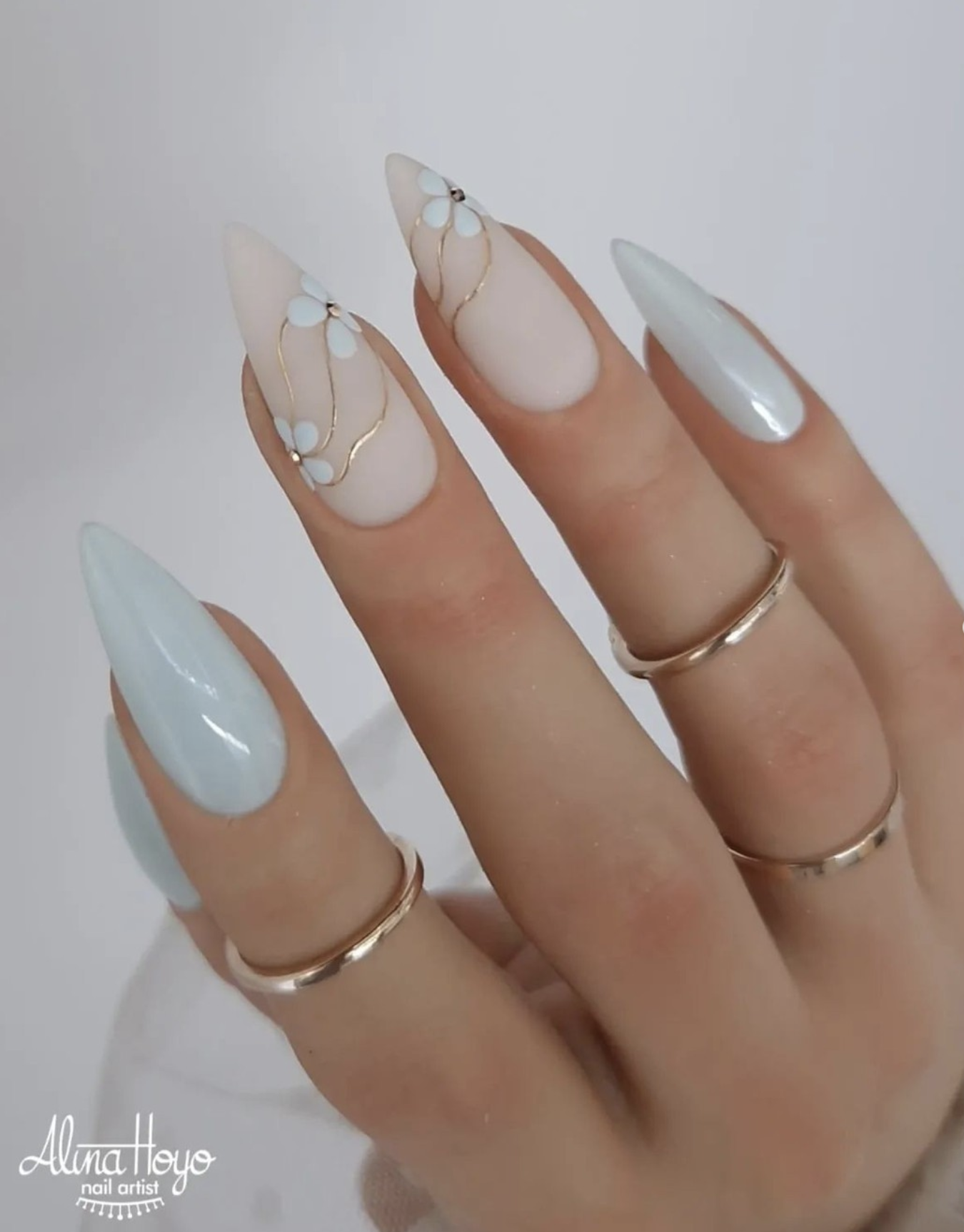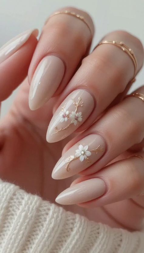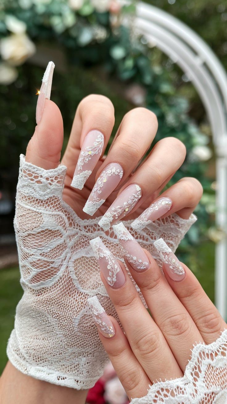 Almond nails are one of the most popular shapes for brides because of their elongated, slenderizing effect. They strike a perfect balance between classic and trendy. This shape pairs beautifully with soft pastels, nude tones, and delicate designs like lace or floral art. Almond nails also look particularly graceful when holding a bouquet or showcasing your ring.