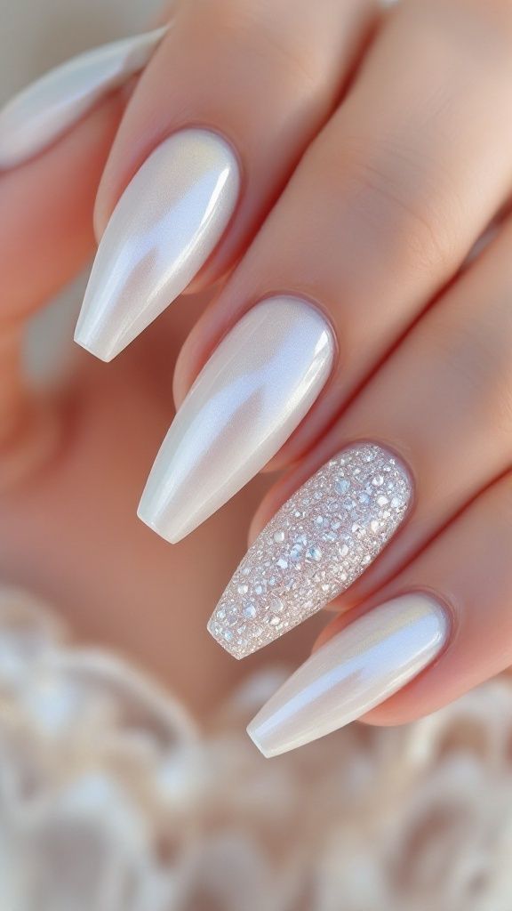 Coffin (or ballerina) nails are bold, sophisticated, and ideal for the modern bride who wants a statement look. This shape works well with dramatic designs like ombré glitter, metallic accents, or intricate rhinestone patterns. Brides with longer nail beds or those using acrylics often opt for coffin nails to achieve that sleek, fashion-forward effect.