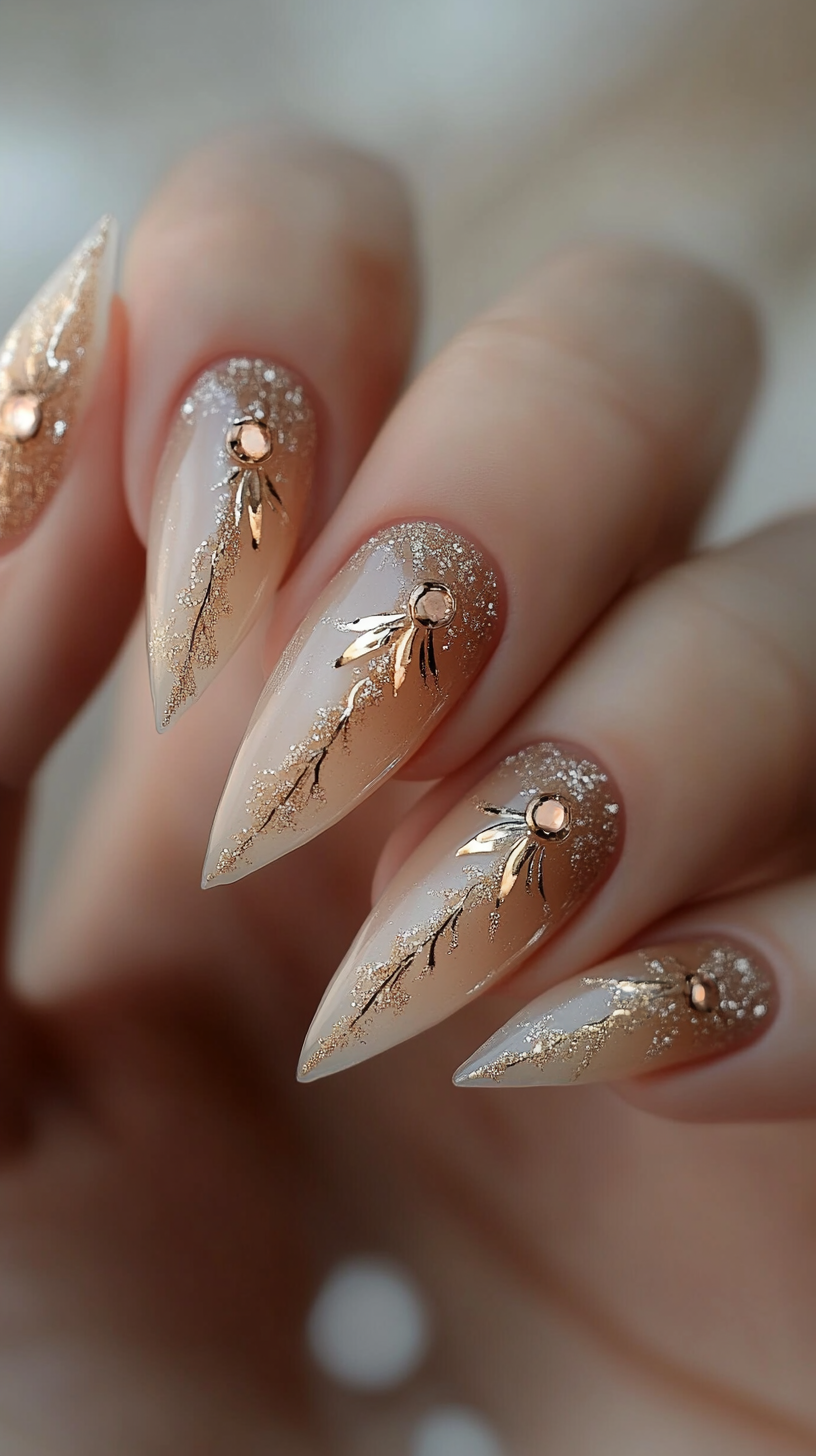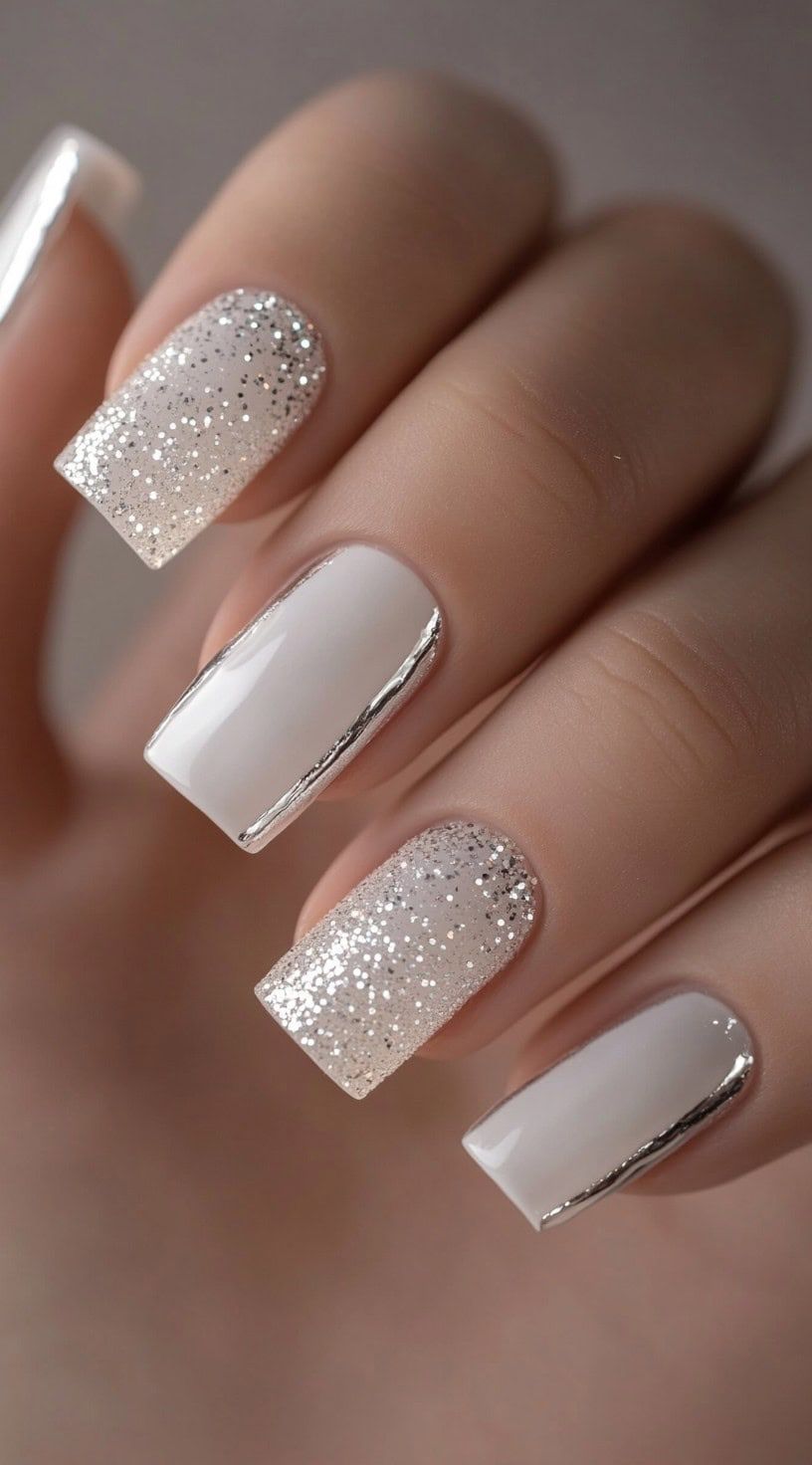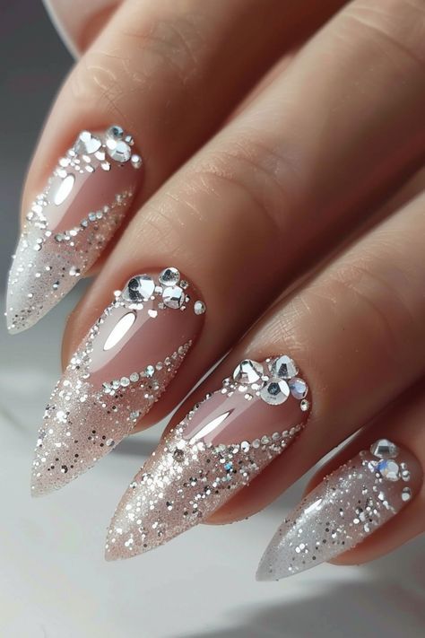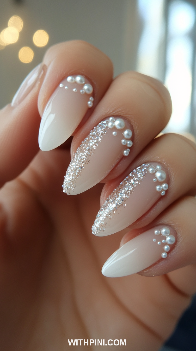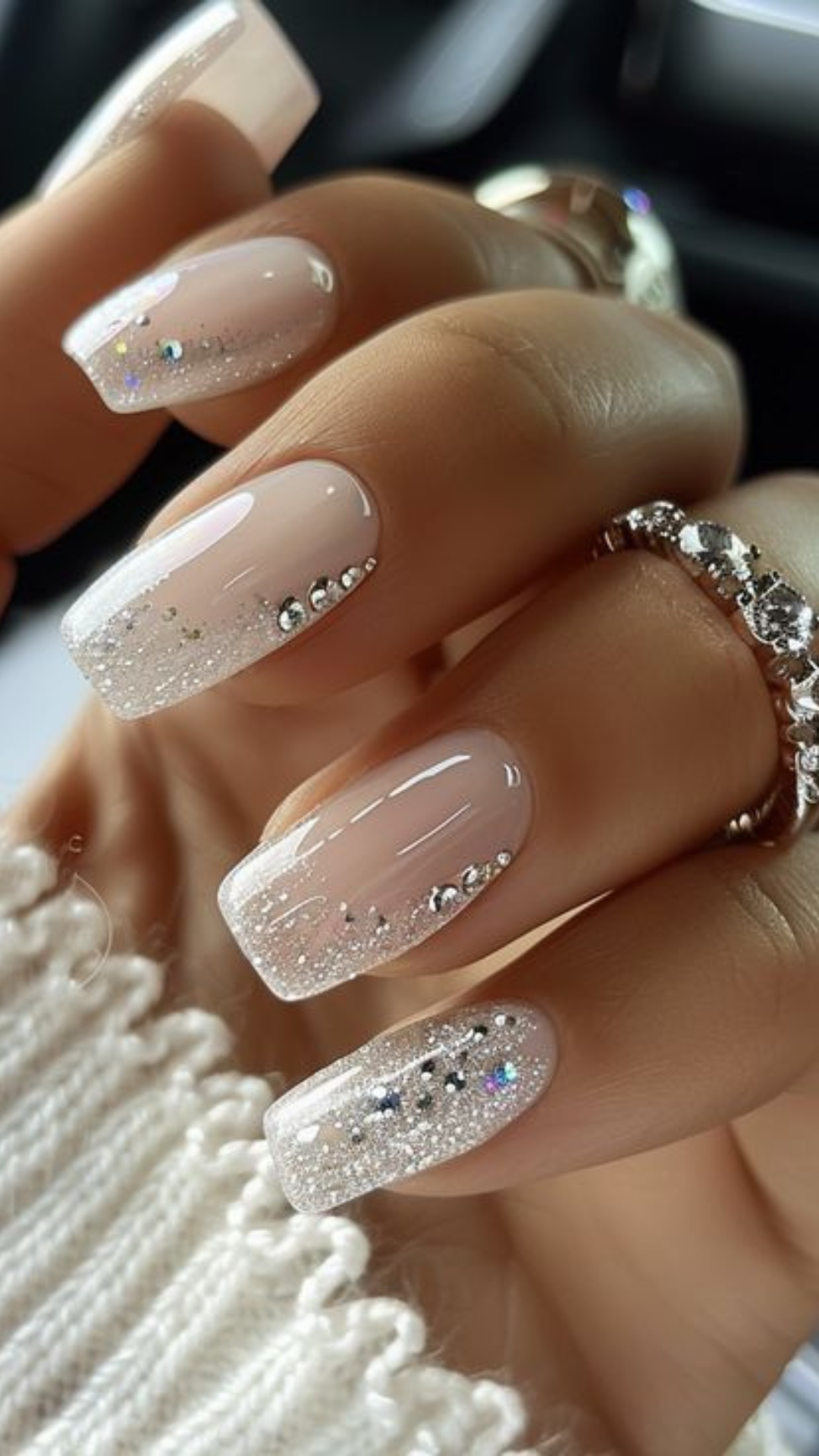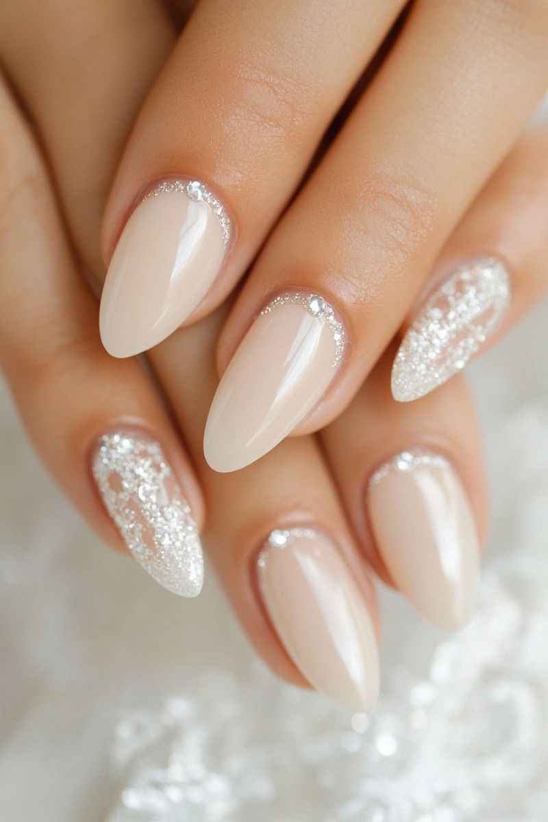 Weddings are a celebration, and what better way to capture that than with a bit of sparkle? Glitter nails can be done tastefully for brides who want shine without going full glam. A popular choice is the “glitter fade,” where fine glitter fades from the tips or cuticles into a neutral base. Another favorite is to highlight just one or two accent nails with shimmer—adding depth without overwhelming the design. Rose gold and champagne glitters are especially popular for weddings, as they pair well with warm-toned accessories and ivory dresses.