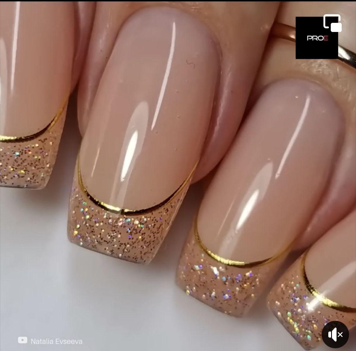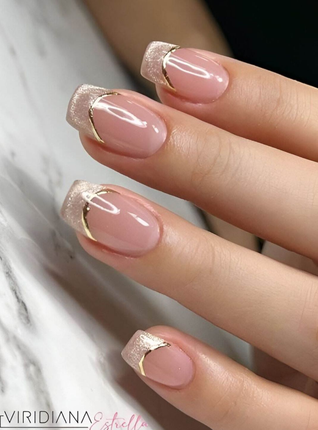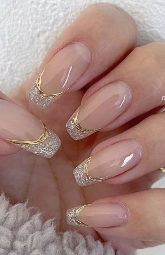 Nude French Manicures Featuring Metallic Gold Stripes